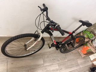 Bicicleta de montaña con un diseño deportivo en color negro y detalles rojos. - Cuadro de metal. - Ruedas todoterreno. - Sillín negro. - Manillar con puños. Hay que cambiarle la rueda de atras,pastillas de freno y ajustar bien los frenos y la cadena,de ahi el precio