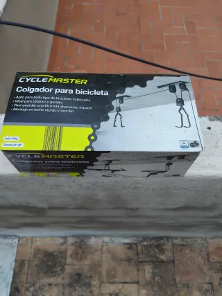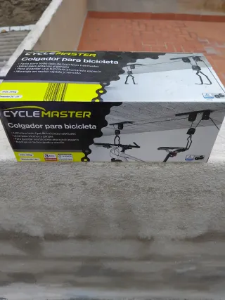 Sistema de poleas Cycle Master para colgar bicicletas en el techo. Ideal para ahorrar espacio en garajes o sótanos. - Apto para todo tipo de bicicletas habituales. - Carga máxima: 30 kg. - Tamaño de rueda compatible: 26-28. - Montaje rápido y sencillo en techo.