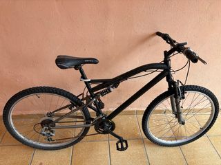 Bicicleta de montaña con doble suspensión, ideal para terrenos irregulares. - Cuadro de metal negro. - Ruedas de 26 pulgadas. - Sillín negro. - Pedales negros.