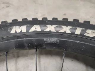 Rueda delantera de e-bike de 27'5 pulgadas con neumático Maxxis de 2,6 a medio uso y disco de freno. - Llanta de aluminio. - Radios de acero. - Válvula de aire. - Disco de freno incluido. Venía montada en una Giant Trance de 2020