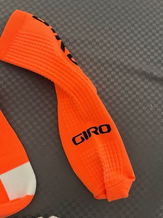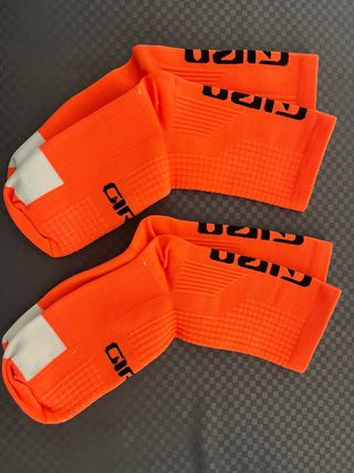 Vendo dos pares de calcetines de ciclismo Giro de color naranja. El precio es de los 2 pares. Sin estrenar - Diseño deportivo y transpirable. - Talla única.