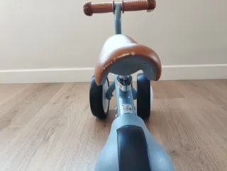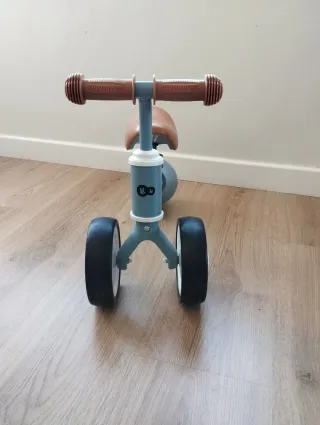 Triciclo de la marca Kinderkraft en color azul y marrón. - Diseño moderno y ligero. - Asiento cómodo. - Manillar con puños texturizados.