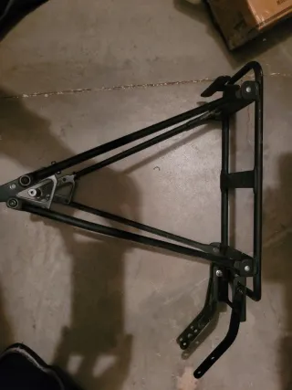 Maletero de bicicleta de color negro, diseñado para ser montado en la parte trasera. - Estructura de metal. - Brazos de soporte ajustables. - Sistema de fijación con gancho.