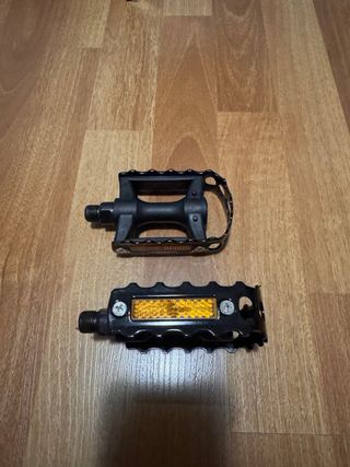 Par de pedales negros para bicicleta, con reflectores naranjas. - Material: Plástico y metal. - Diseño con tacos para mejor agarre. - Reflectores integrados para mayor visibilidad.