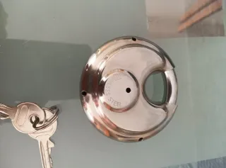 Candado de arco de acero inoxidable, con acabado brillante y resistente. - Material: Acero inoxidable. - Diseño circular. - Incluye dos llaves.