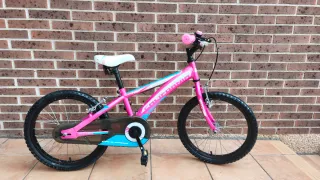 Bicicleta infantil de 14 pulgadas en color rosa, ideal para los más pequeños. - 2 usos contados por que le queda grande. - Ruedines de apoyo incluidos. - Cesta delantera de mimbre no es la de las fotos. - Timbre.