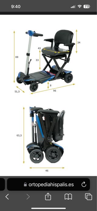 Escooter eléctrico plegable en color azul. Ideal para desplazamientos urbanos y fácil de transportar. - Dimensiones plegado: 63,5 cm de alto. - Dimensiones desplegado: 88 cm de alto. - Ancho: 46 cm. - Largo: 96 cm. - Ancho del asiento: 43 cm. - Profundidad del asiento: 38 cm. - Altura del asiento al suelo: 33 cm. - Distancia del suelo a la base: 8 cm. - Ancho total: 51,5 cm.