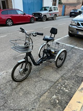 Triciclo eléctrico con cesta delantera y trasera. Ideal para paseos cómodos. - Asiento con respaldo. - Cestas metálicas. - Ruedas de 20 pulgadas.