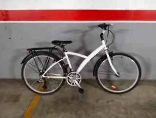Bicicleta urbana de color blanco, ideal para desplazamientos diarios. - Cuadro de aluminio. - Ruedas de 28 pulgadas. - Portabultos trasero. - Guardabarros. - Sillín negro.