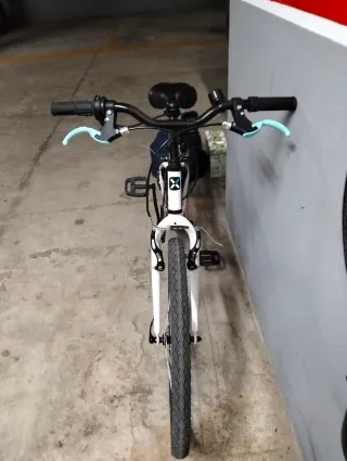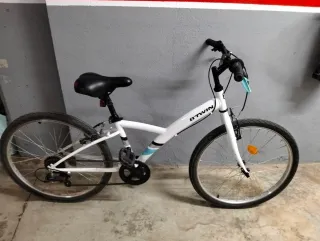 Bicicleta BTWIN de color blanco, ideal para paseos. - Cuadro de aluminio. - Ruedas de 24 pulgadas. - Frenos V-brake. - Cambio Shimano de 6 velocidades.
