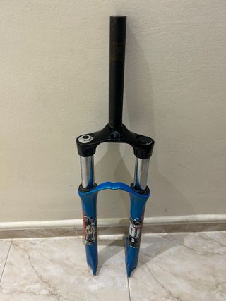 Horquilla Marzocchi DJ3 en color azul. - Barras de suspensión plateadas. - Diseño robusto para uso en bicicleta.