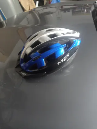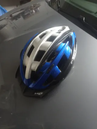 Casco de bicicleta de la marca MET, con un diseño moderno y deportivo. - Colores: azul, blanco y negro. - Visera integrada. - Múltiples ventilaciones. - Talla ajustable