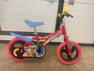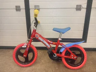 Bicicleta infantil con diseño de Patrulla Canina. - Cuadro de color rojo. - Ruedas de color rojo. - Asiento azul. - Guardabarros azul.