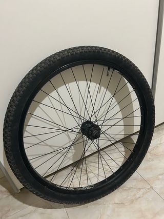 Rueda de bicicleta de 24 pulgadas en perfectas condiciones. No se le ha dado mucho uso, todos los radios bien ajustados, llanta casi nueva, bien guardada. - Llanta de aluminio. - Neumático con tacos para mayor agarre. - Radios de acero. - Practicamente nueva. PRECIO NEGOCIABLE 🚨