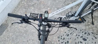 Bicicleta eléctrica modificada. Manillar elevado y potencia nuevas para pasar de talla M a L. - Batería extraible. - Ruedas todoterreno. - Sillín cómodo de gel. - Portaequipajes trasero y delantero Acelerador de mano, el de pedal no funciona. Frenos de disco hidraúlicos y motor seminuevos solo 600 km Potencia 250W bateria 36V autonomia de 30 km sin pedalear, velocidad limitada a 30 km/h.