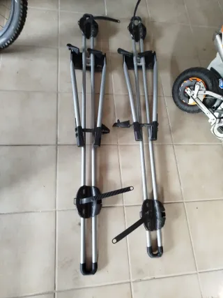 Portabicicletas de la marca Thule, diseñado para transportar bicicletas de forma segura. - Fabricado en aluminio. - Sistema de fijación robusto. - Logo de Thule visible en las barras. Solo dos usos. 50€ cada uno.