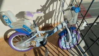 Bicicleta infantil con temática de Frozen, ideal para los más pequeños. Incluye un asiento trasero para llevar a un amigo o muñeco. - Diseño con personajes de Frozen y Olaf. - Ruedines para mayor estabilidad. - Cesta delantera. - Color blanco y azul con detalles morados.