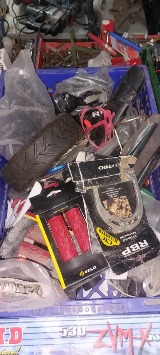 Lote de recambios para bicicleta, ideal para mantenimiento o personalización. - Puños de manillar VELO rojos con diseño de llamas. - Cubierta de rueda negra con dibujo. - Componentes TEKTRO y RBP. - Incluye piezas de freno y otros accesorios.