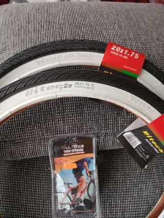 Se venden dos cubiertas Ritech de 20x1.75 con banda blanca y 1 cámara nueva Multimer.La caja de cámara está abierta pero la cámara está nueva sin usar - Cubiertas Ritech 20x1.75 (47-400). - Cámaras Multimer 20x1.75 (47-400) con válvula AIV.