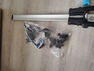 Portabicicletas de la marca Hast, diseñado para el transporte seguro de bicicletas. - Fabricado en aluminio. - Incluye dos llaves para el sistema de bloqueo. - Se aprecian accesorios de montaje en una bolsa. - Solo se a usado 5 viajes