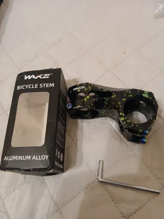 NUEVO en su caja Potencia para bicicleta marca Wake, fabricada en aluminio. - Material: Aleación de aluminio. - Diseño con salpicaduras verdes y negras. - Incluye llave Allen.