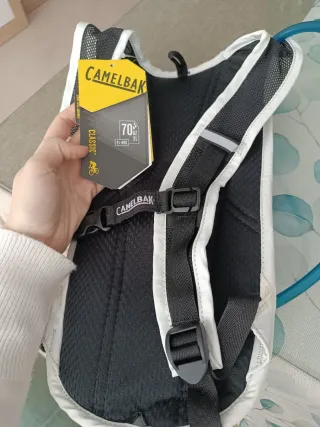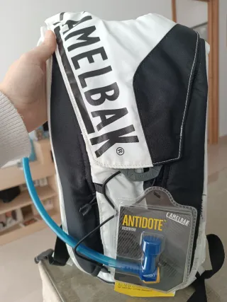 Mochila de hidratación Camelbak Classic con depósito de 2 litros. - Color blanco y negro. - Incluye depósito Antidote. - Tubo de hidratación azul. Nuevo, con etiqueta.