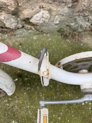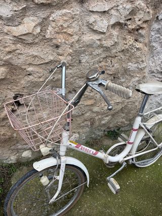 Bicicleta plegable antigua con cesta delantera. - Color blanco con detalles en rojo. - Cesta de color rosa pálido. - Timbre metálico. - Guardabarros delantero y trasero. IDEAL PARA RESTAURAR O COLECCIONISTA