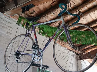 Bicicleta de carretera Esmaltina, ideal para paseos y entrenamientos. - Cuadro de color morado y blanco. - Manillar con cinta azul. - Ruedas de carretera. Solo necesita una apuesta a punto. Se incluye en el precio la polea de almacenaje para colgarla.