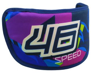 Funda protectora textil para la visera de un casco. - Cierre con banda elástica negra.