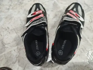 Zapatillas de ciclismo de montaña con sistema de calas incluidas. Talla 40 pero es para un 38 o 39 - Cierre con velcro y hebilla. - Diseño deportivo en negro, blanco y rojo. - Suela con tacos para mejor agarre. - Calas Shimano