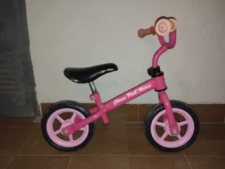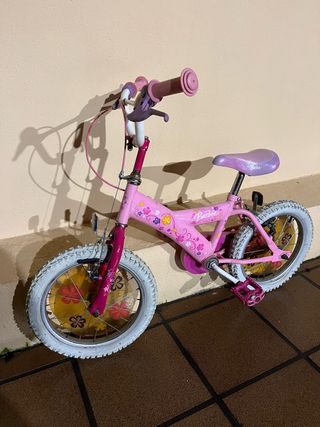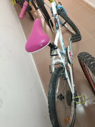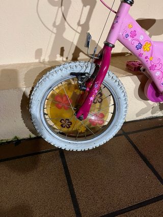 Bicicleta infantil de color rosa con detalles de flores. - Ruedas blancas. - Sillín brillante. - Puños rosas. Esta usada y abría que limpiarla bien.