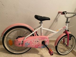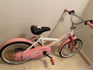 Bicicleta infantil BTWIN con diseño de princesa, ideal para niñas de 3 a 8 años. Perfecta para iniciarse en el mundo del ciclismo. - Color blanco y rosa. - Ruedines incluidos. - Cadena protegida. Muy buen estado, verla sin ningún compromiso.