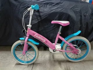 Bicicleta infantil de color rosa con detalles en azul. Presenta el nombre Fantasy en el cuadro. - Ruedas con llantas azules y neumáticos blancos. - Guardabarros delanteros y traseros en color azul. - Sillín rosa con detalles blancos. - Puños del manillar en color azul. - para niños entre 5 a 7 años. - la cadena está oxidada. - Las ruedas están desinfladas.