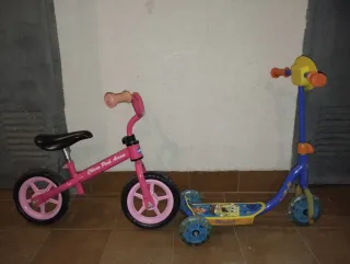 Conjunto de bicicleta de equilibrio y patinete de tres ruedas para niños pequeños. - Bicicleta de equilibrio color rosa con ruedas y puños a juego. - Patinete de tres ruedas azul con plataforma decorada y manillar amarillo. Ver y probar en Arganda del Rey. El precio es por los dos. No hago envíos.