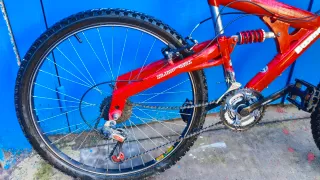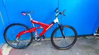 Bicicleta de montaña Boomerang Cobra Sport en muy buen estado. Sistema doble de suspensión. Características principales: Cuadro: Acero Hi-Ten resistente en color rojo vibrante. Suspensión: Doble Transmisión Shimano: Equipada con 21 velocidades. Cambio trasero Shimano Megarange Mandos de cambio: Shimano RevoShift (tipo giratorio en el puño), muy fáciles de usar Ruedas: 26 pulgadas con neumáticos.