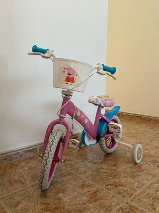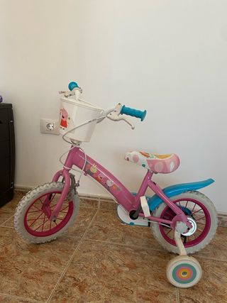 Preciosa bicicleta infantil de color rosa con diseño de Peppa Pig. Ideal para los más pequeños. - Cesta delantera. - Ruedines de apoyo. - Puños de goma.