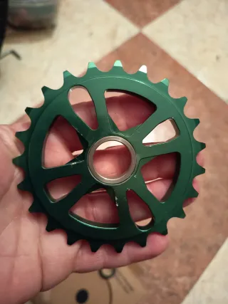 Plato de BMX de color verde. - Diseño con múltiples radios. - Incluye rodamiento central.