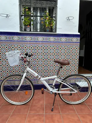 Bicicleta B'TWIN de 24 pulgadas, ideal para niños y niñas. Perfecta para iniciarse en el ciclismo. - Color blanco con detalles en marrón. - Cesta delantera. - Sillín marrón de piel. - Pata de cabra. - poco uso, le haría falta llenar las ruedas. VENTA EN PERSONA