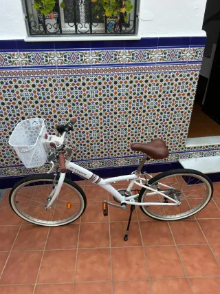 Bicicleta plegable de color blanco, ideal para desplazamientos urbanos o para llevarla contigo a donde vayas. - Cuadro plegable. - Ruedas de tamaño reducido. - Sillín negro. - Portaequipajes trasero.