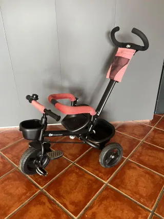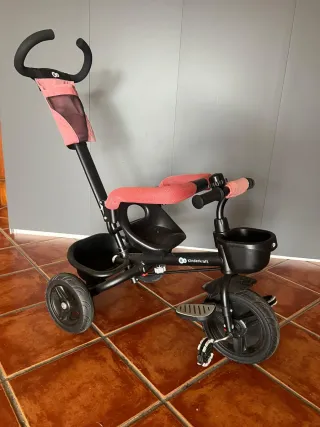 Triciclo infantil con un diseño moderno y funcional, ideal para paseos. - Estructura principal en color negro. - Asiento y detalles en color rosa. - Incluye cesta de almacenamiento. - Empuñaduras de manillar en color rosa. - También tiene una capota