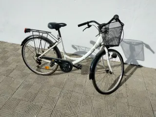 Bicicleta de paseo en color blanco, ideal para desplazamientos urbanos. - Cuadro de bicicleta de paseo. - Incluye cesta delantera. - Portabultos trasero.