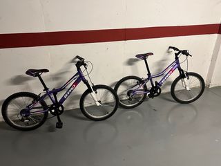 Se venden dos bicicletas B-PRO de montaña, ideales para niños. Son de color morado con detalles en blanco y rosa. - Tamaño de rueda: 20 pulgadas. - Marca: B-PRO. - Diseño deportivo. - Cambio de 7 marchas en el puño.
