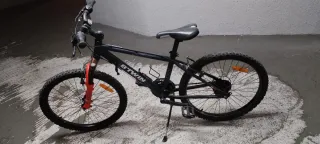 Bicicleta Rockrider 700 en color negro y detalles en naranja Para niños de 8-12 años. - Cuadro de aluminio. - Ruedas de 24 pulgadas. - Frenos de disco. - Suspensión delantera.