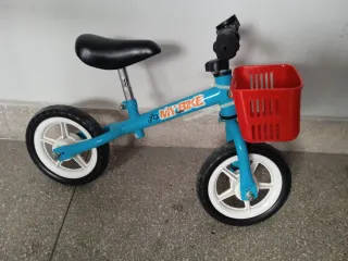 Bicicleta sin pedales. Ideal para los más pequeños. - Ruedas negras con llantas azules. - Sillín azul. - Manillar negro.