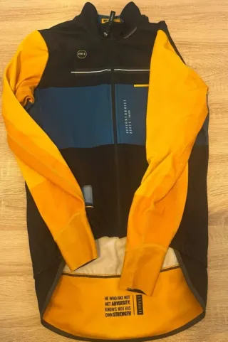 Chaqueta de ciclismo Gobik talla M con diseño Nonconformist. - Mangas largas en color amarillo. - Paneles en azul y negro. - Inscripción Roots y Est. 2010. - Frase He who has not met adversity, knows not his own strength en el bajo.