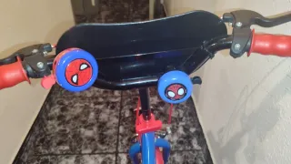 Bicicleta infantil con diseño de Spiderman. - Color azul y rojo. - Ruedines incluidos. - dos timbres Edad de 3 a 6 años