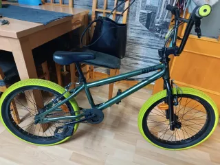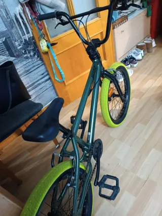 Bicicleta BMX verde con ruedas amarillas