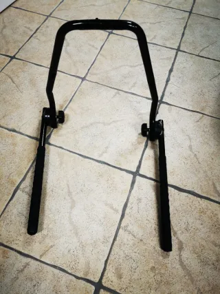 Soporte de pared para bicicletas, fabricado en metal negro. - Diseño en forma de U. - Brazos con agarre acolchado. - Mecanismo de ajuste.