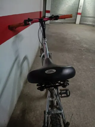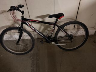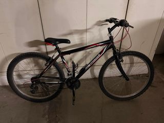 Bicicleta de montaña en buen estado, lista para usar. - Cuadro de color negro con detalles rojos y blancos. - Ruedas de 26 pulgadas. - Sillín negro con detalles rojos. - Frenos delanteros y traseros.
