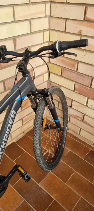 Bicicleta de montaña Rockrider ST 100 con ruedas de 26 pulgadas. Ideal para iniciarse en el ciclismo. Ruedas: 26 pulgadas, ideales para jóvenes (9-12 años) o personas de estatura baja. Transmisión: 21 velocidades con cambios de puño giratorio. Estado: Cuadro de aluminio ligero, frenos revisados y neumáticos con buen dibujo. Extras: Incluye portabidón ya instalado. Número de serie: DK4B4PA299 para total transparencia.